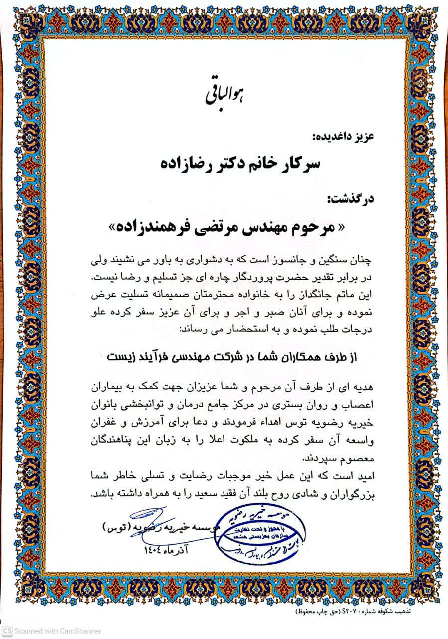 این یادبود، سهمی است در امور کار خیر و تامین نیازهای ضروری فرزندان توس؛ یادبودی ارام، صمیمی و سرشار از معنا برای روح عزیز از دست رفته و دل های بازماندگان.
